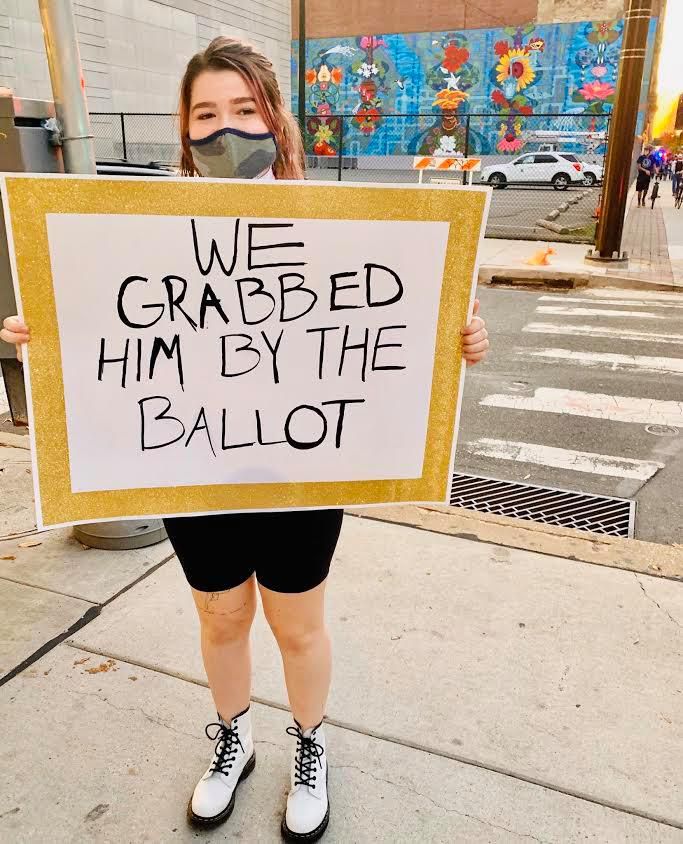 Sur le trottoir d’en face, une jeune manifestante portait sur elle un slogan ironique concernant Trump: «We have grabbed him by the ballot» (Nous l’avons attrapé par le bulletin); la référence vise des propos sexistes et grossiers de Donald Trump à l’égard des femmes il y a quelques années de cela (ndlr: «Grab them by the pussy»).