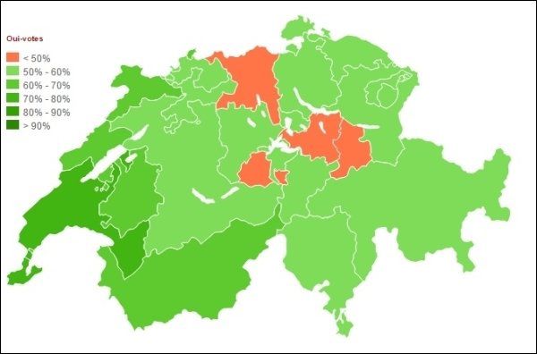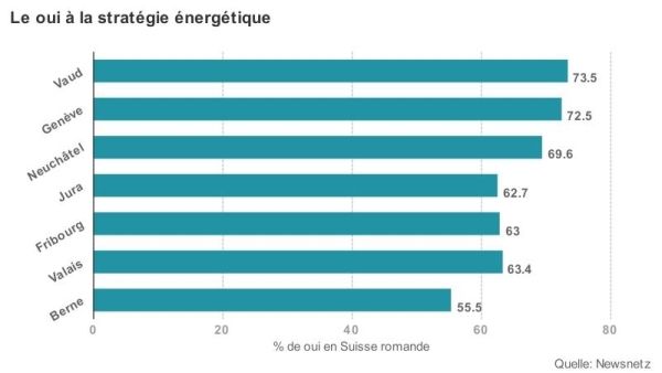 Le tournant vert est principalement porté par la Suisse romande. Le canton de Vaud s'est montré le plus enthousiaste avec 73,5% de «oui». Il est suivi de Genève qui soutient le projet à 72,5%, de Neuchâtel à 69,6%. Le Valais, avec ses nombreux barrages hydrauliques, dit «oui» à 63,4%, Fribourg à 63,2% et le Jura à 62,7%, le Tessin avec 56,7%. De l'autre côté de la Sarine, les cantons de Bâle-Ville, Zurich et des Grisons se sont montrés les plus favorables avec respectivement 63,4%, 58,8% et 58,7% des voix.