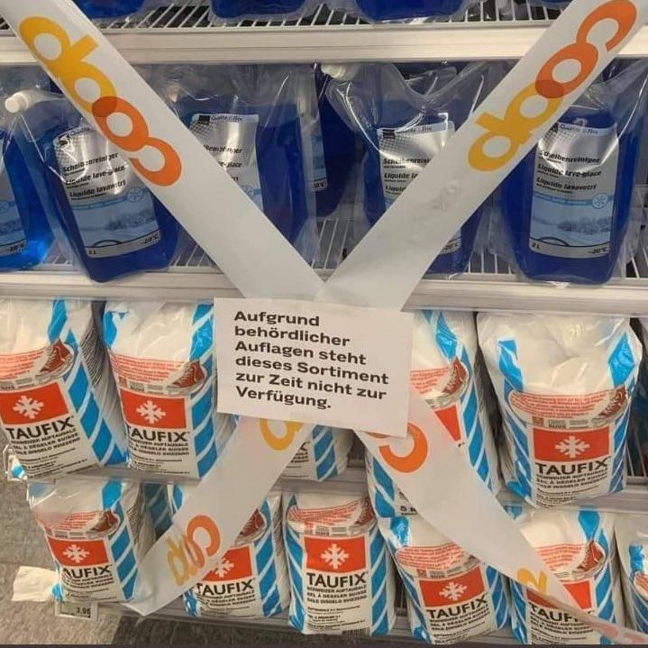 Das Problem daran: Das stimmt nicht. Der Verkauf von Streusalz ist in der Schweiz keineswegs verboten, wie Melanie Grüter, Mediensprecherin von Coop, bestätigt: «Gemäss der Verordnung des Bundes bieten wir Streusalz und Scheibenputzmittel in unseren Verkaufsstellen an.»